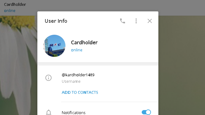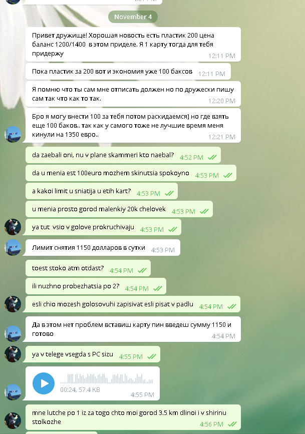 меня посылают нахуй , удаляют переписку и он меняет свои телеграм ид только проеб в том что у меня есть скрины с перепиской как его босс мне пишит что он якобы от кардхолдера и указывает его оригинальный ид .кстати на данный момент оригинальный ид не существует .